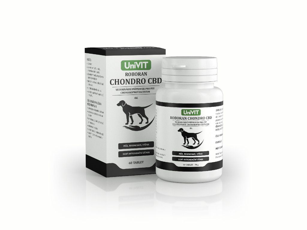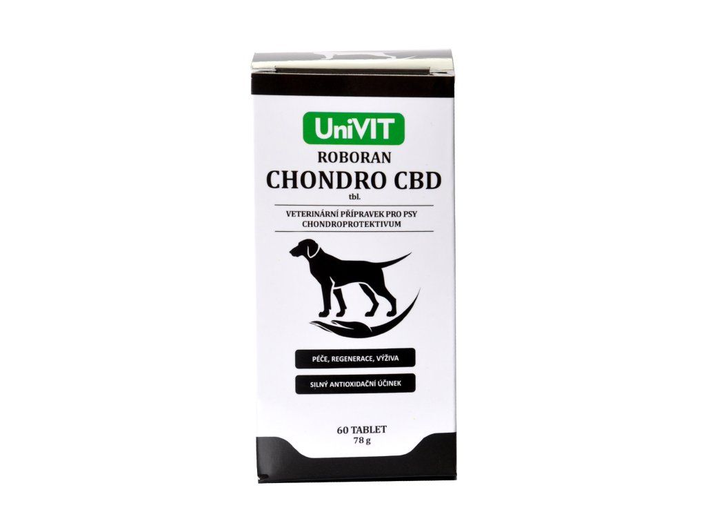 ROBORAN CHONDRO CBD tbl. je veterinární přípravek s CBD, slouží pro podporu a regeneraci kloubní chrupavky, k výživě kloubů a zlepšení jejich pohyblivosti. Hlavní účinné složky tvoří prášek ze žraločí chrupavky, extrakt z novozélandské zelené mušle, kanabidiol, kyselina hyaluronová, kolagen, methylsulfonylmethan, extrakt z kurkumovníku a Boswelie serraty. CBD napomáhá zmírňovat bolest, vykazuje protizánětlivý účinek, přispívá ke zpomalení dalšího rozvoje artritidy a napomáhá ke zmenšení otoků. MSM je přírodní látky, která se podílí na udržení normální funkce pojivových tkání, včetně chrupavek, kloubů a svalů. Kolagen je hlavní bílkovina pojivové tkáně a je součástí chrupavky, vazů, šlach, ale i cév a pokožky. Podporuje zdraví kloubů, zlepšuje výživu chrupavky a stimuluje regenerační procesy v kloubech. Glukosamin má specifickou afinitu k chrupavčité tkáni, přispívá k tvorbě a obnově pojivové tkáně. Chondroitinsulfát přispívá ke zpomalení degenerativních změn kloubních chrupavek a zlepšuje jejich pohyblivost. Kurkumovník přispívá ke zmírnění projevů zánětlivých procesů, má antioxidační účinky. Kyselina hyaluronová obsažená v kloubní tekutině na sebe váže vodu, má vysokou viskozitu, působí proto jako lubrikans. Boswellia serrata - hlavní složkou extraktu jsou boswelové kyseliny, které mají blahodárné účinky, působí i protizánětlivě.