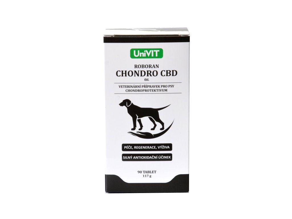 ROBORAN CHONDRO CBD tbl. je veterinární přípravek s CBD, slouží pro podporu a regeneraci kloubní chrupavky, k výživě kloubů a zlepšení jejich pohyblivosti. Hlavní účinné složky tvoří prášek ze žraločí chrupavky, extrakt z novozélandské zelené mušle, kanabidiol, kyselina hyaluronová, kolagen, methylsulfonylmethan, extrakt z kurkumovníku a Boswelie serraty. CBD napomáhá zmírňovat bolest, vykazuje protizánětlivý účinek, přispívá ke zpomalení dalšího rozvoje artritidy a napomáhá ke zmenšení otoků. MSM je přírodní látky, která se podílí na udržení normální funkce pojivových tkání, včetně chrupavek, kloubů a svalů. Kolagen je hlavní bílkovina pojivové tkáně a je součástí chrupavky, vazů, šlach, ale i cév a pokožky. Podporuje zdraví kloubů, zlepšuje výživu chrupavky a stimuluje regenerační procesy v kloubech. Glukosamin má specifickou afinitu k chrupavčité tkáni, přispívá k tvorbě a obnově pojivové tkáně. Chondroitinsulfát přispívá ke zpomalení degenerativních změn kloubních chrupavek a zlepšuje jejich pohyblivost. Kurkumovník přispívá ke zmírnění projevů zánětlivých procesů, má antioxidační účinky. Kyselina hyaluronová obsažená v kloubní tekutině na sebe váže vodu, má vysokou viskozitu, působí proto jako lubrikans. Boswellia serrata - hlavní složkou extraktu jsou boswelové kyseliny, které mají blahodárné účinky, působí i protizánětlivě.